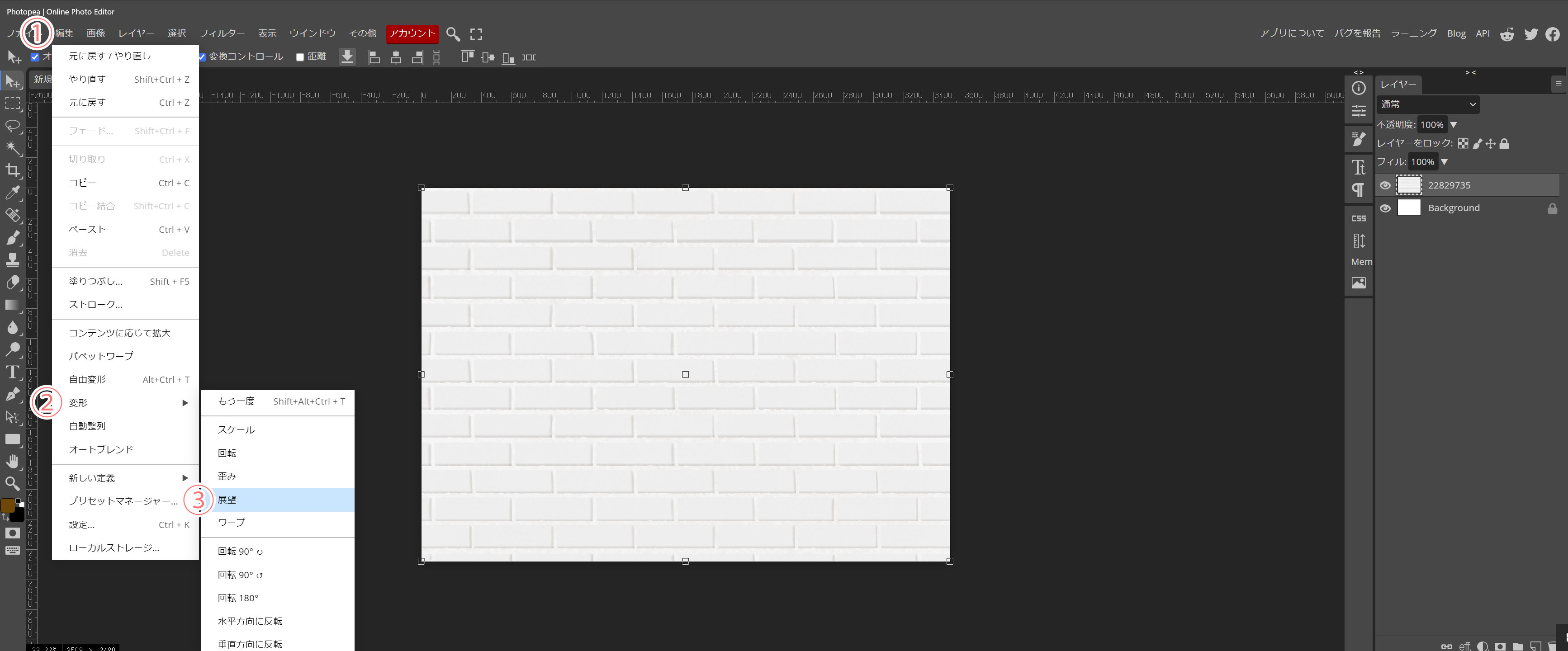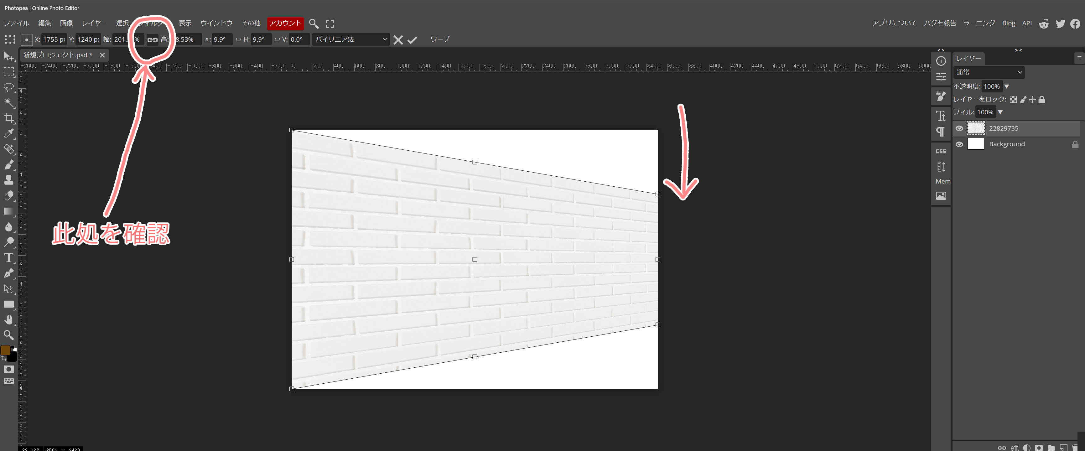 フォトピーの展望(フォトショップでは、遠近法)と言われる変形を使用して、平面の背景に立体感を付けて行きたいと思います。
