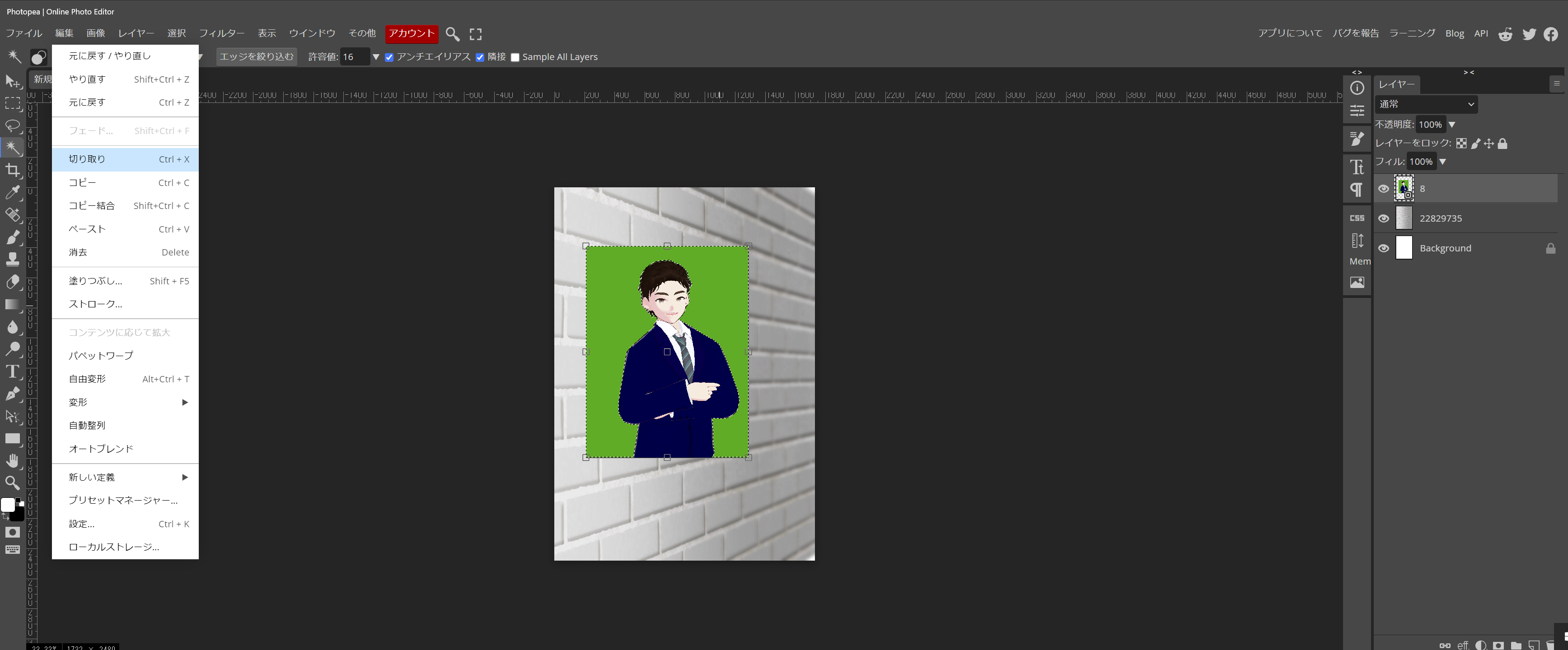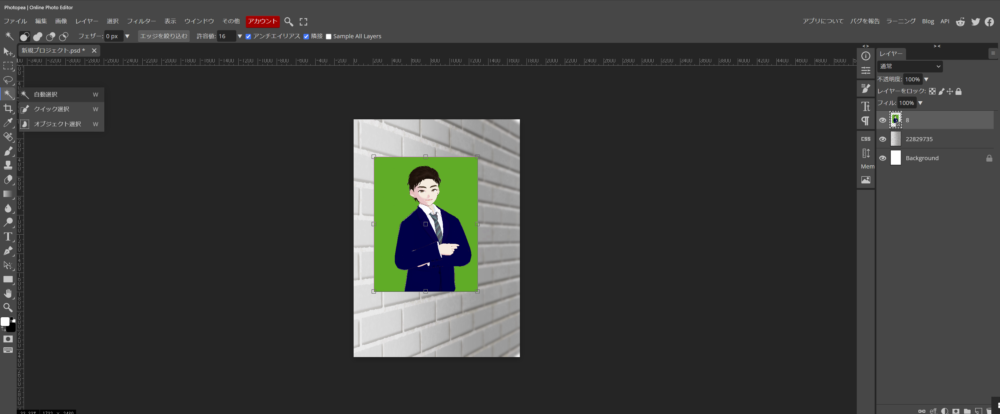 - ②左のパレットから、自動選択を選んで、緑の部分(切り取りたい所をクリック)、次に上段の