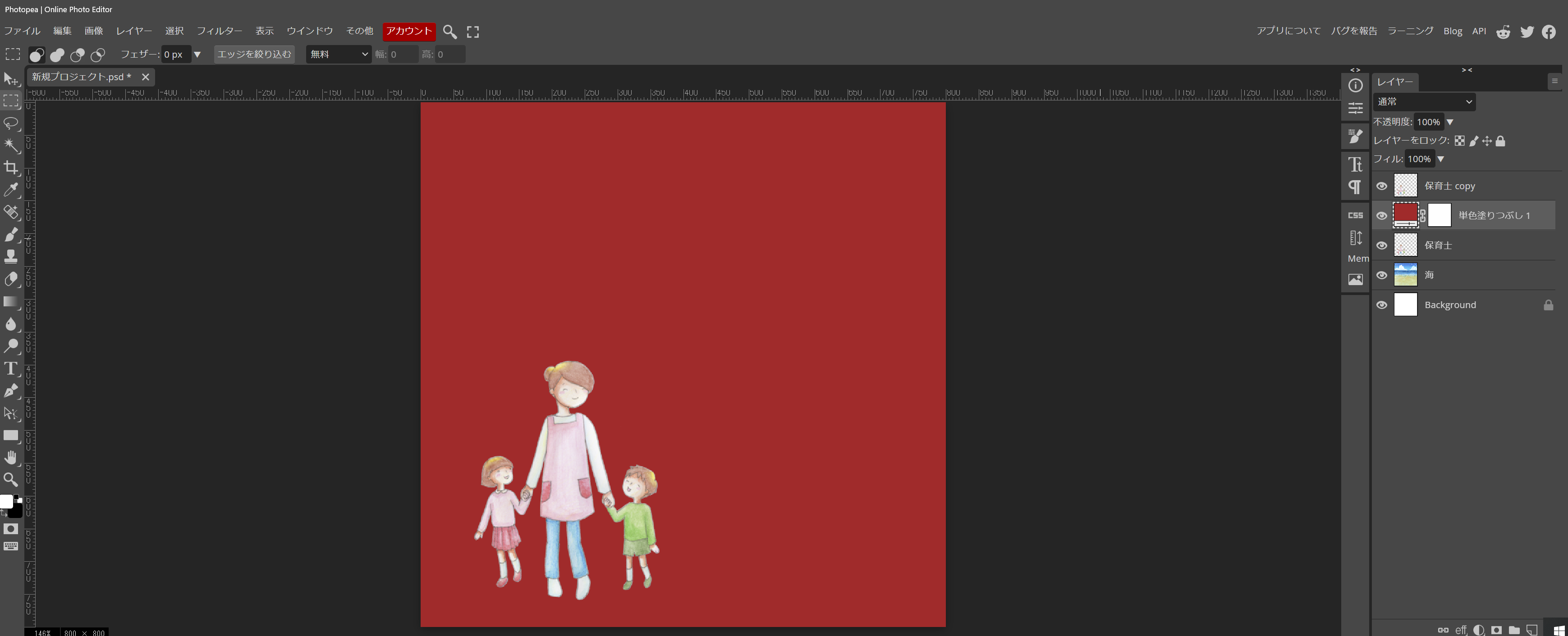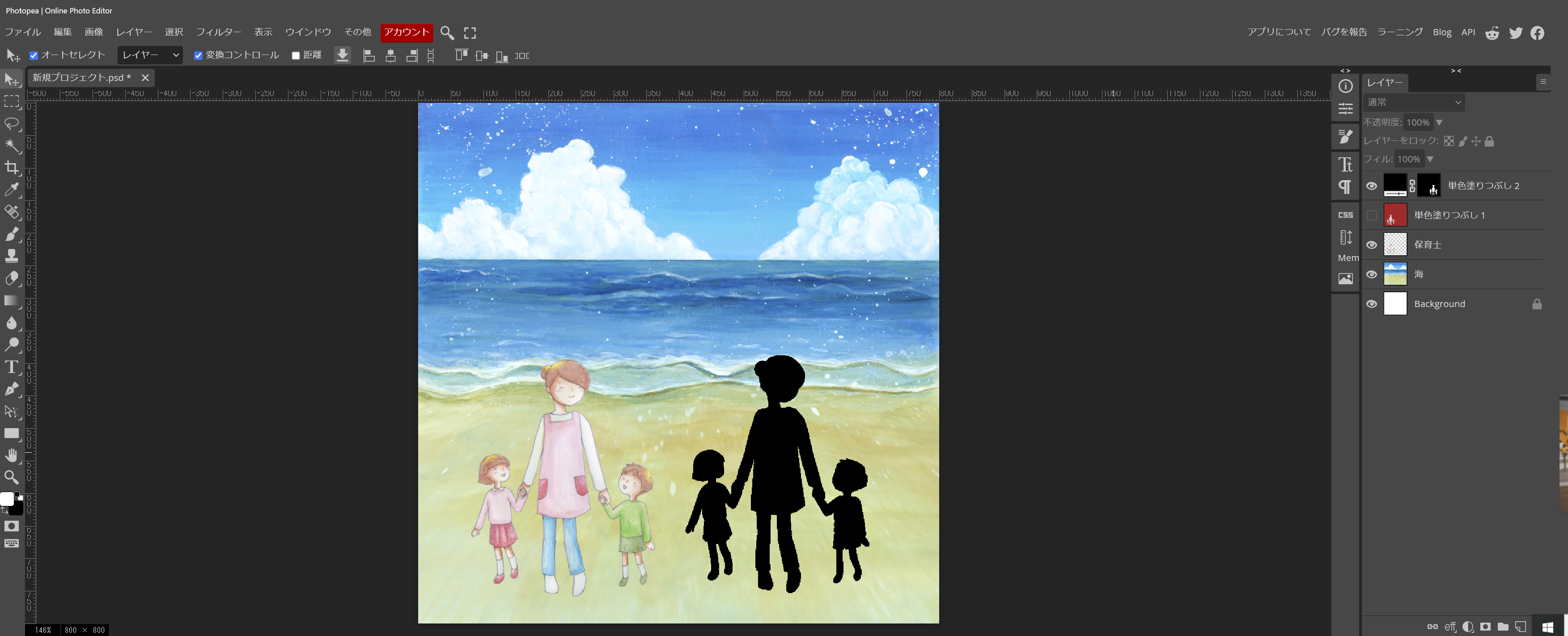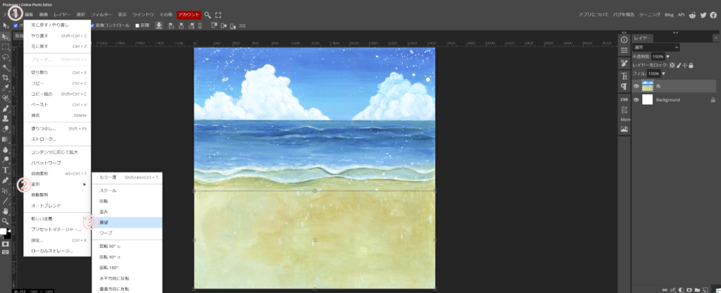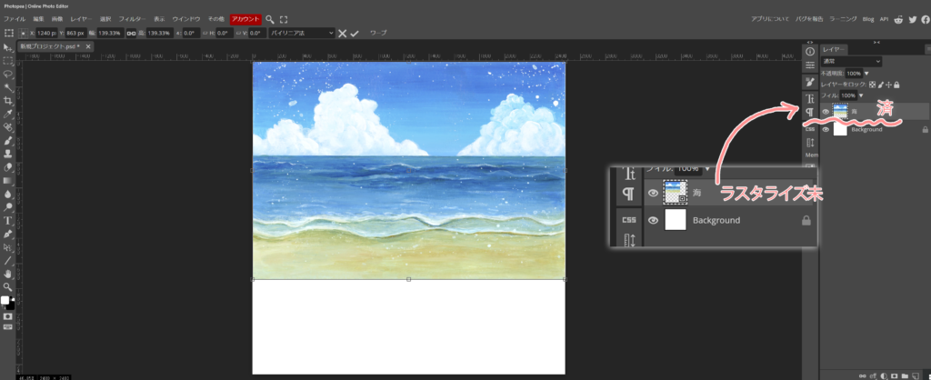 正方形の壁紙に置いた海のイラストを横一杯に大きくしたら、ラスタライズします。私は、良く忘れるので、載せた時、すぐやってしまいます。(本来は、拡大してからやるのが手順です><)