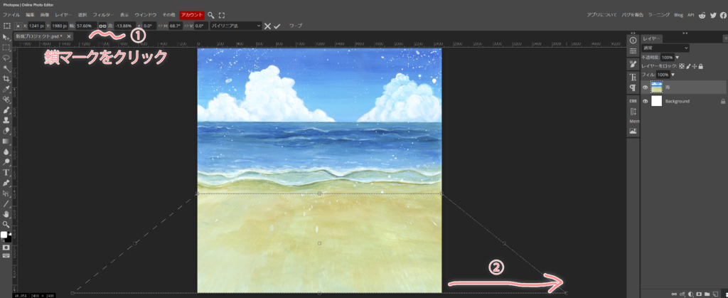 此処で、必ず①鎖マークの印を戻してから、②画像の端を、横に引っ張ります。