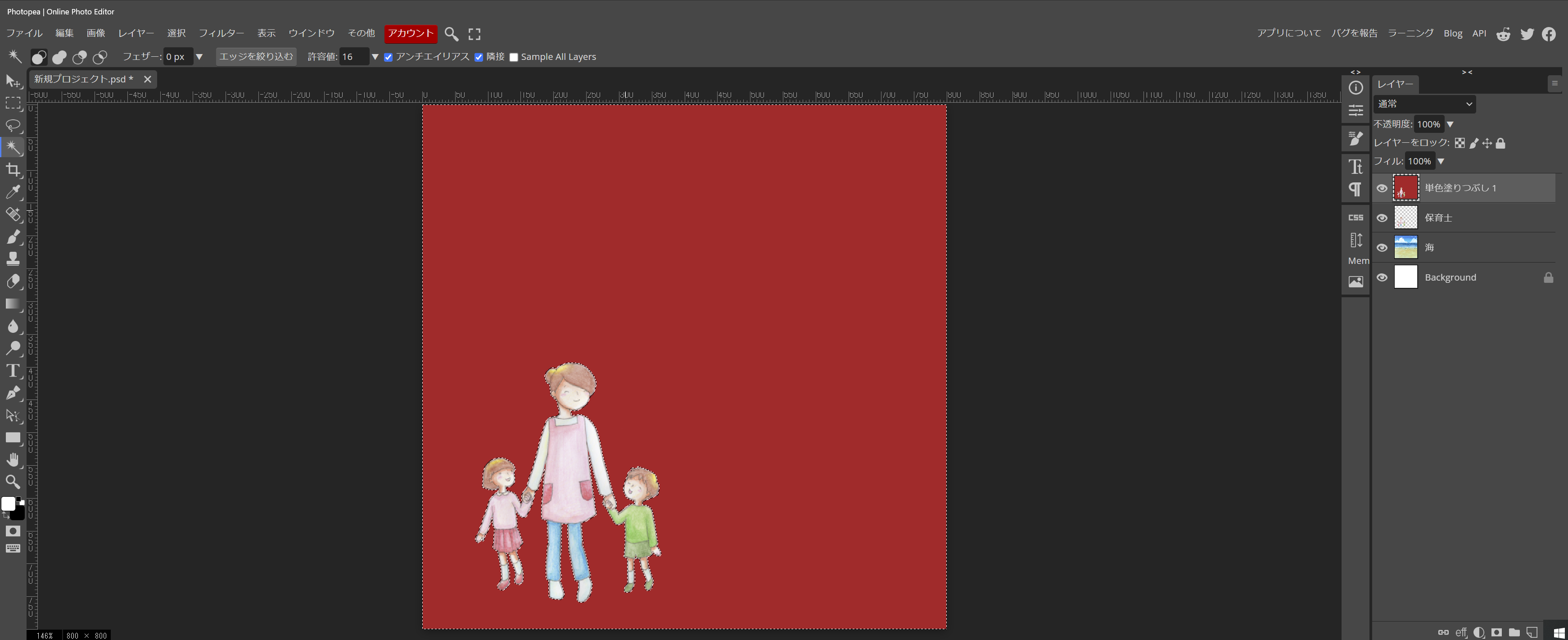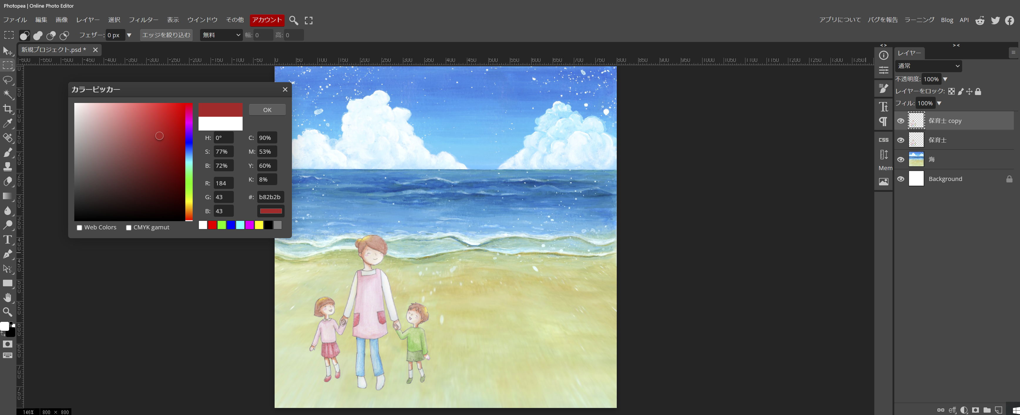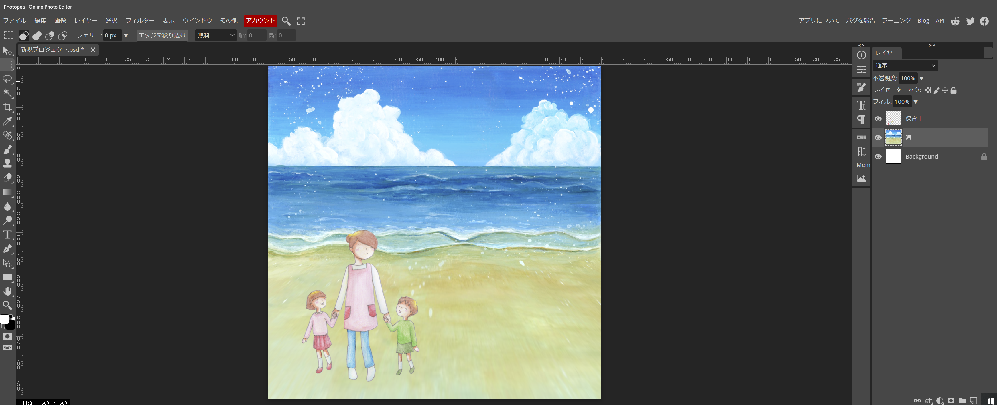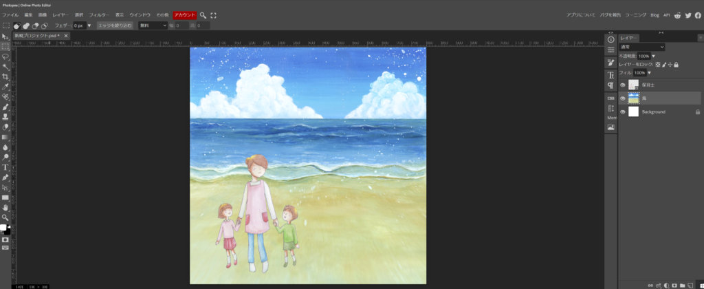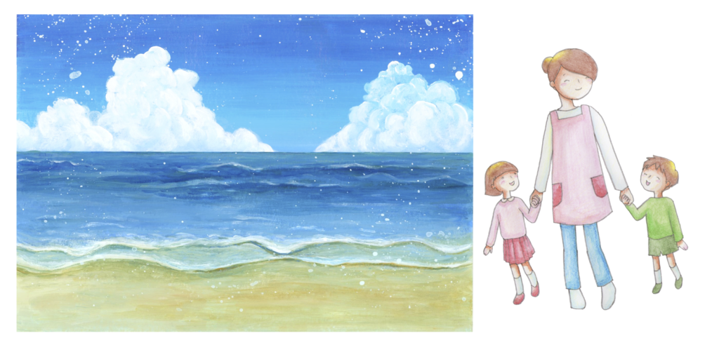 では、先ず、海のイラストをやって見ます。最終的には、浜辺に遊びに来た子供たちのイラストを作りたいと考えました。丁度、いい感じの物が有れば、良いですが、海のイラストは、浜辺の部分が少なくて、