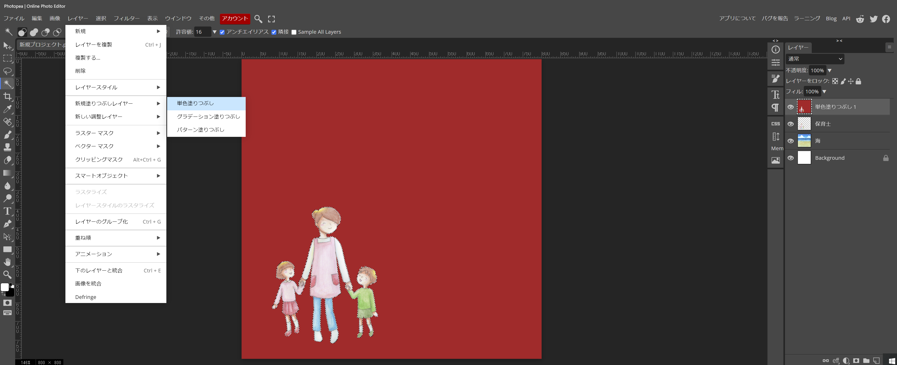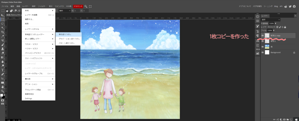 - すぐ下に、適当は単色のレイヤーを作ります(切り取り易い様に、はっきりした色が良いです)