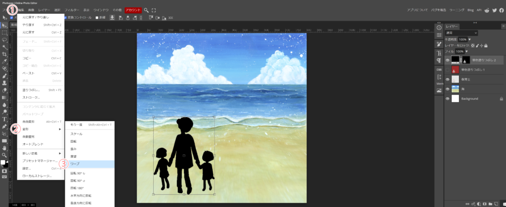 - 上段の①編集から、②変形、③ワープと進みます。