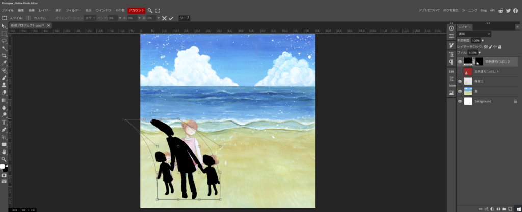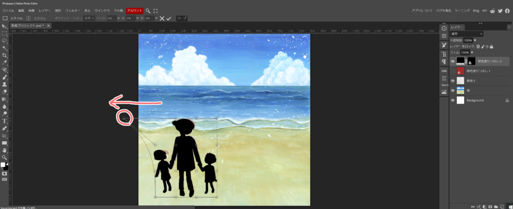 - 今回は、変形のワープを使って、影を歪めてみます。