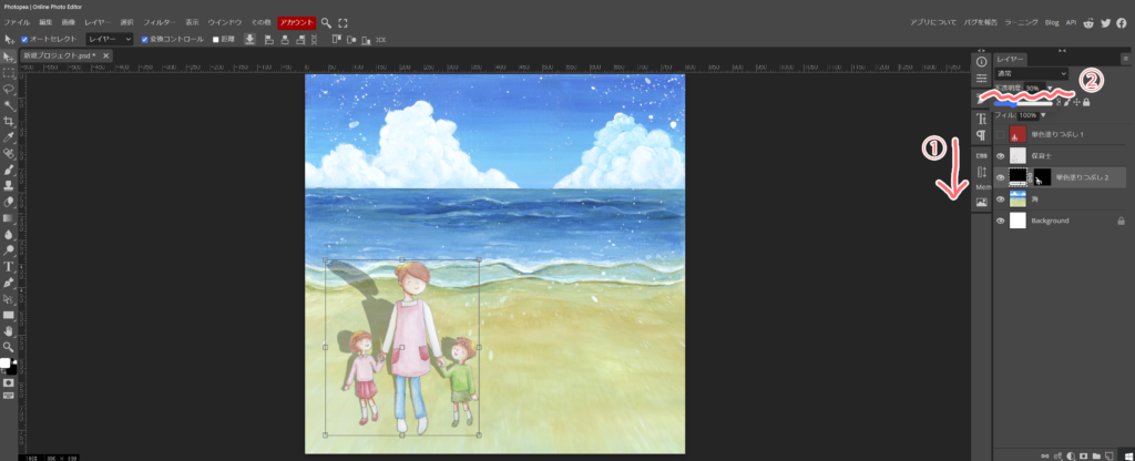 最後に、①影のレイヤーを保育士さんのレイヤ―の下に移動して、影が少しきつい感じがしたので、②不透明度を30%にしました。