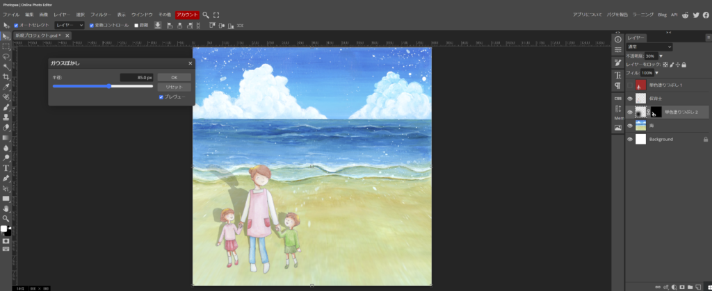 上段のフィルターから、ぼかし、ガウスぼかしと進んで貰い、85pxにしてみました。
