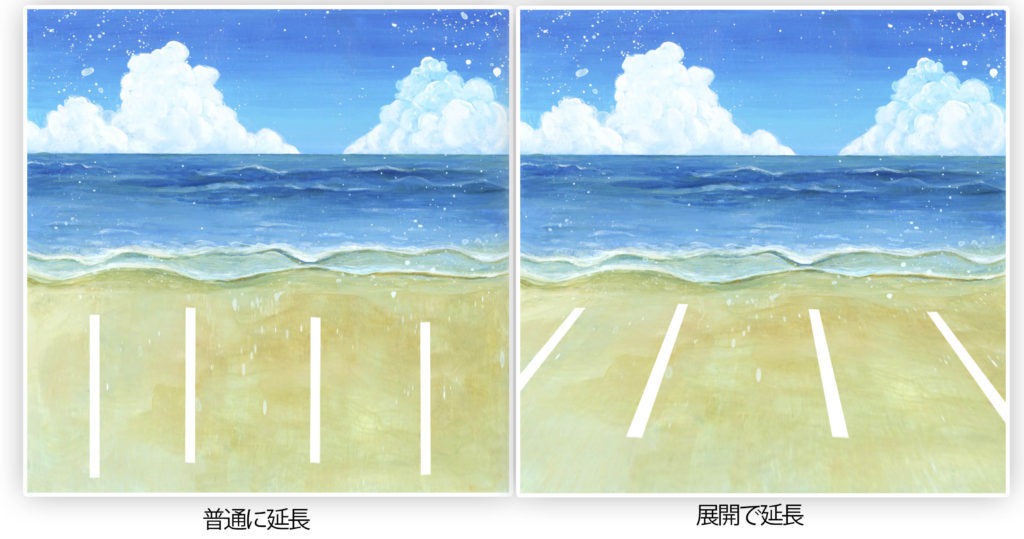 分かりやすくする為に、予め画像に白い線を引いておきましたが、左の普通に延長では、只、下に延長しただけに見えるのに対して、右の展開を使った拡張では、白のラインが、最初から引いて有った様に見えます。