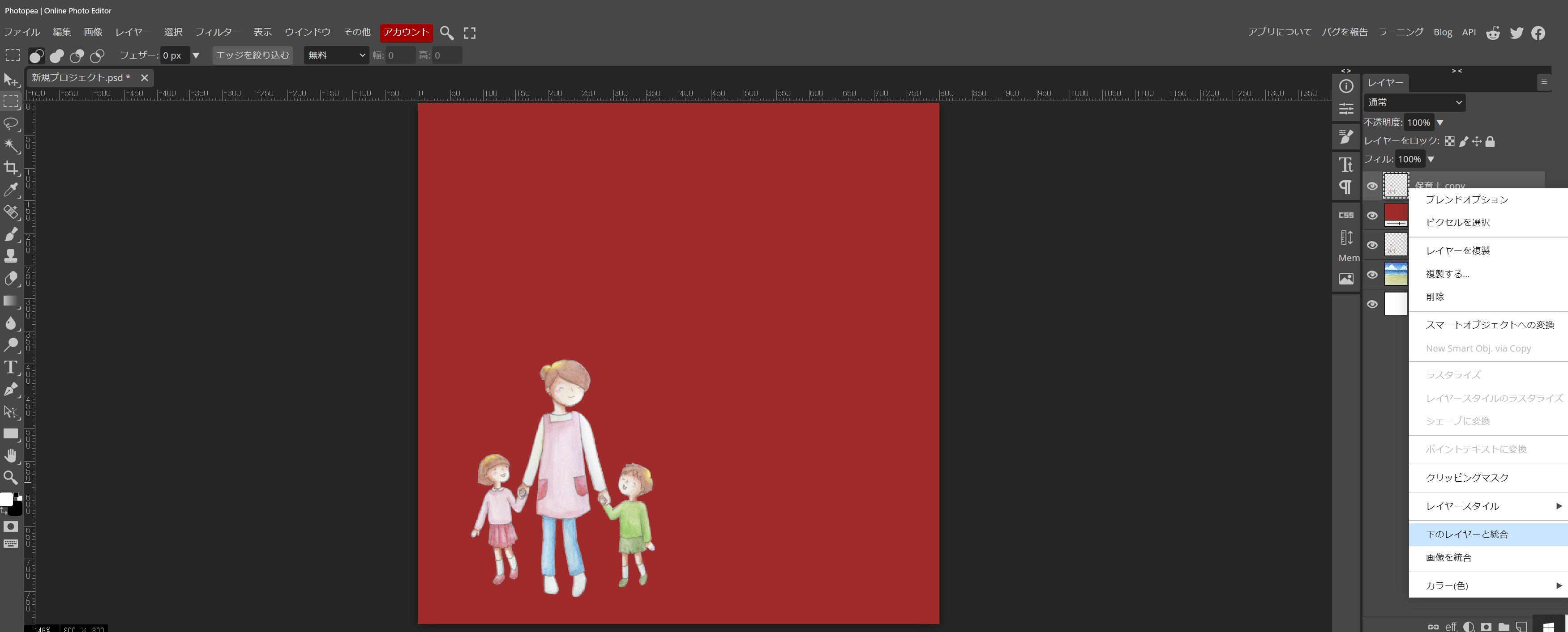 単色のレイヤーと統合してしまうと、作業が増えてしまいます(後から、単色部分を切り取っても全然OKです)