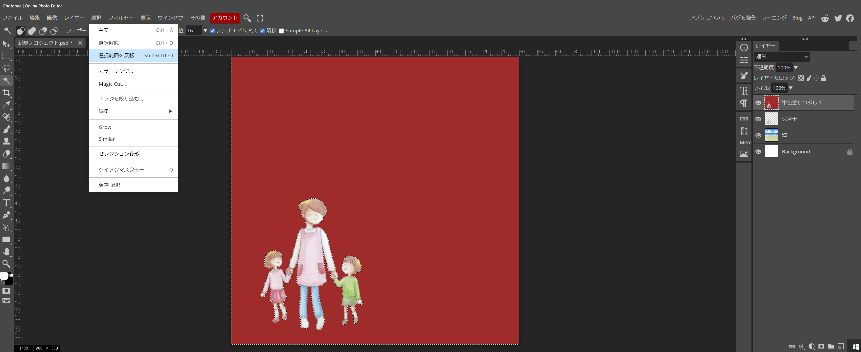 - 最初に、単色レイヤーを自動選択したら、選択範囲を反転します。