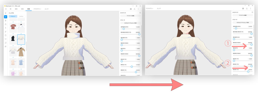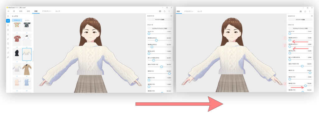 次は、右の項目を下にずらして、袖を調整します。