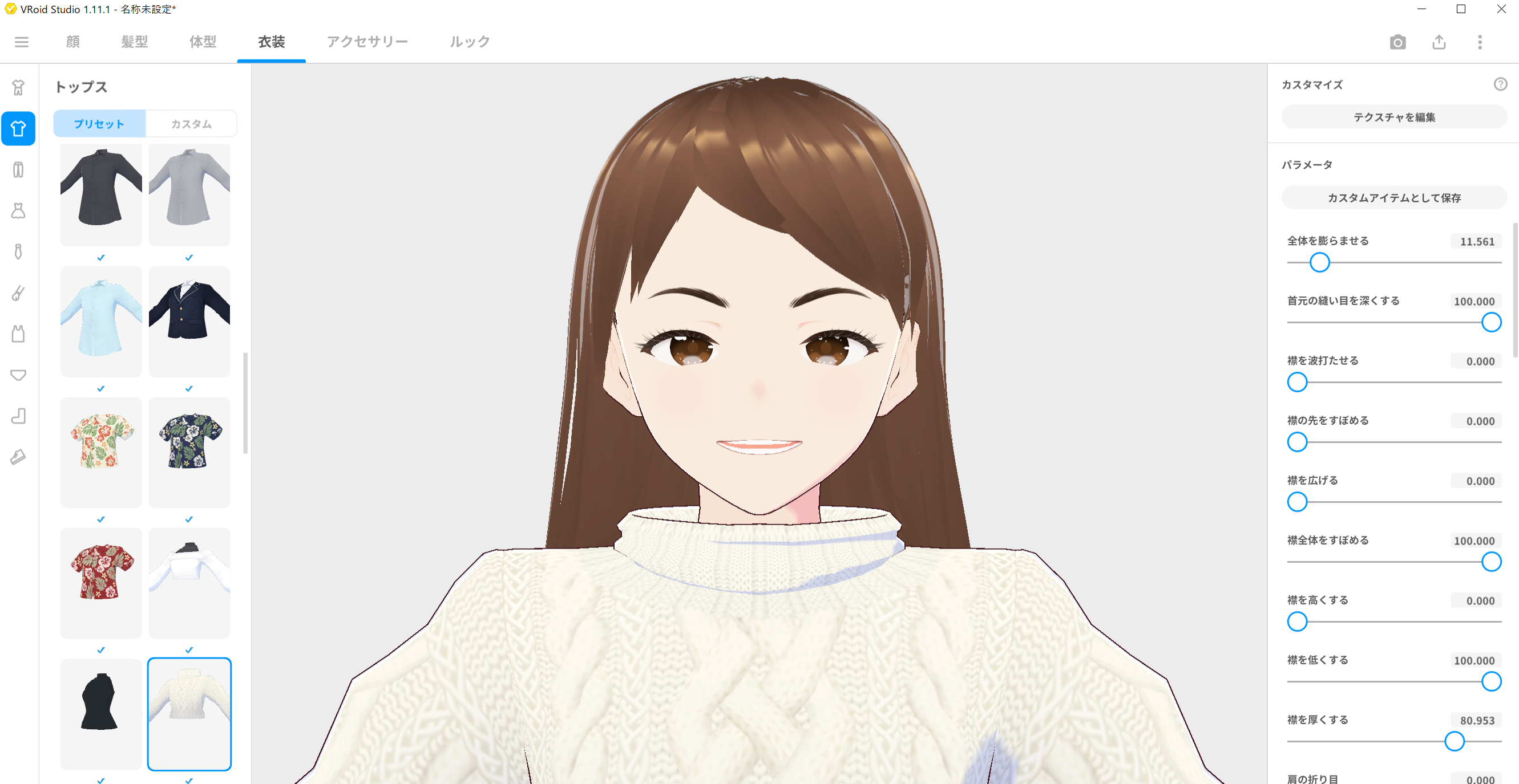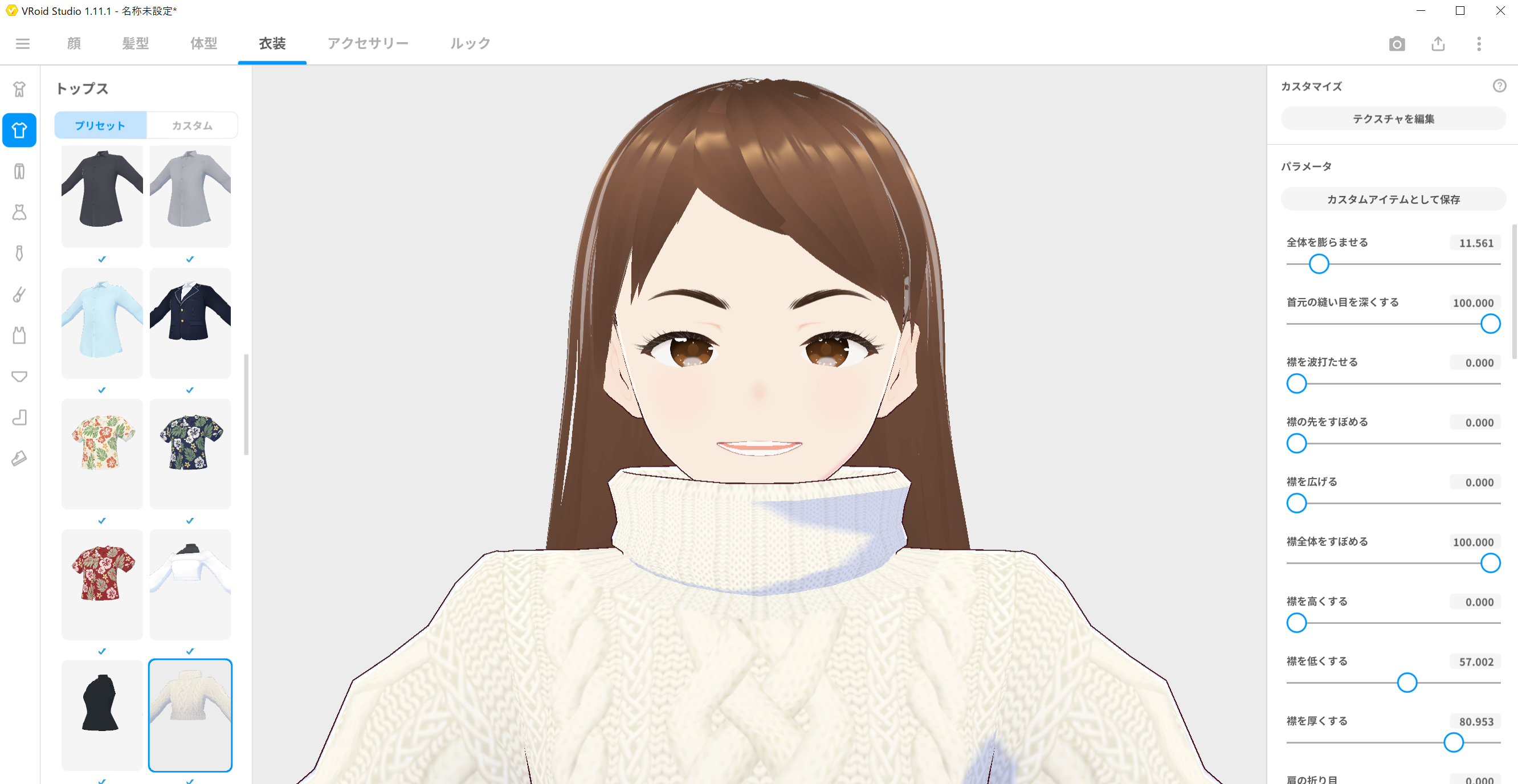 デフォルトの設定が、ティーシャツなので、余り感じませんが、襟の有る服装にしますと、大分印象が違います。