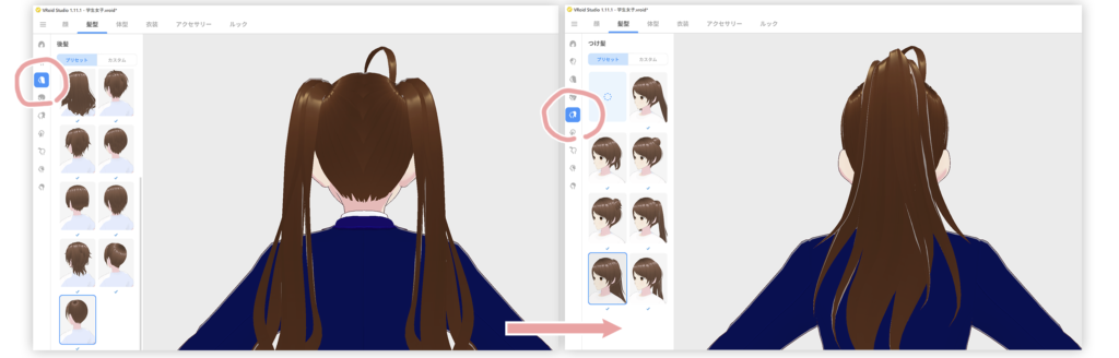 更に下の後ろ髪を選択して、付け毛を選択します。