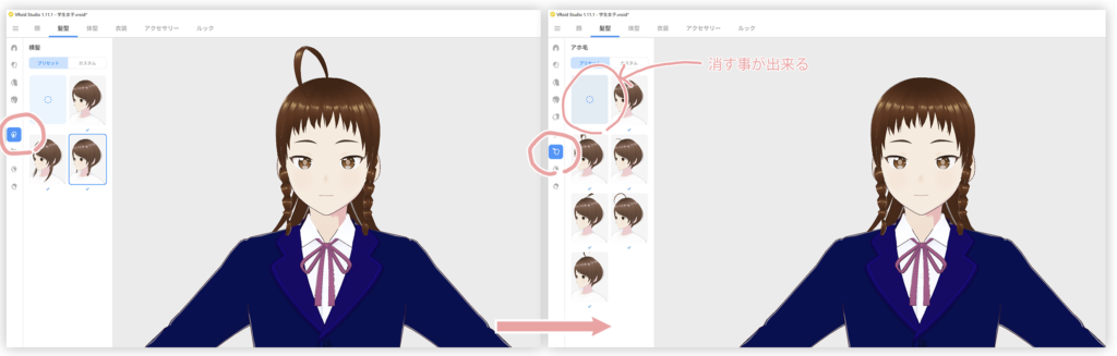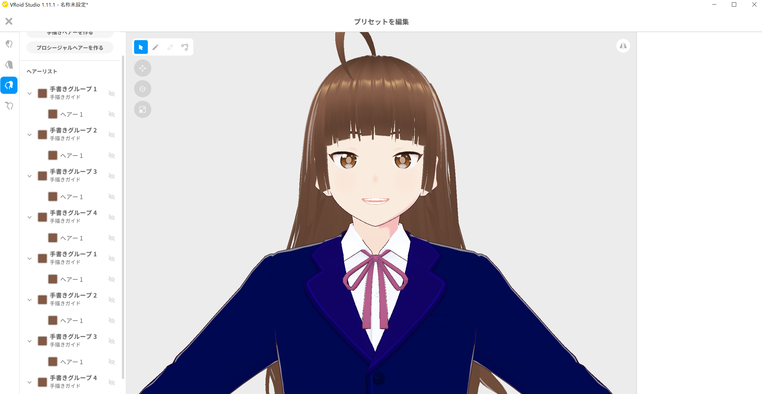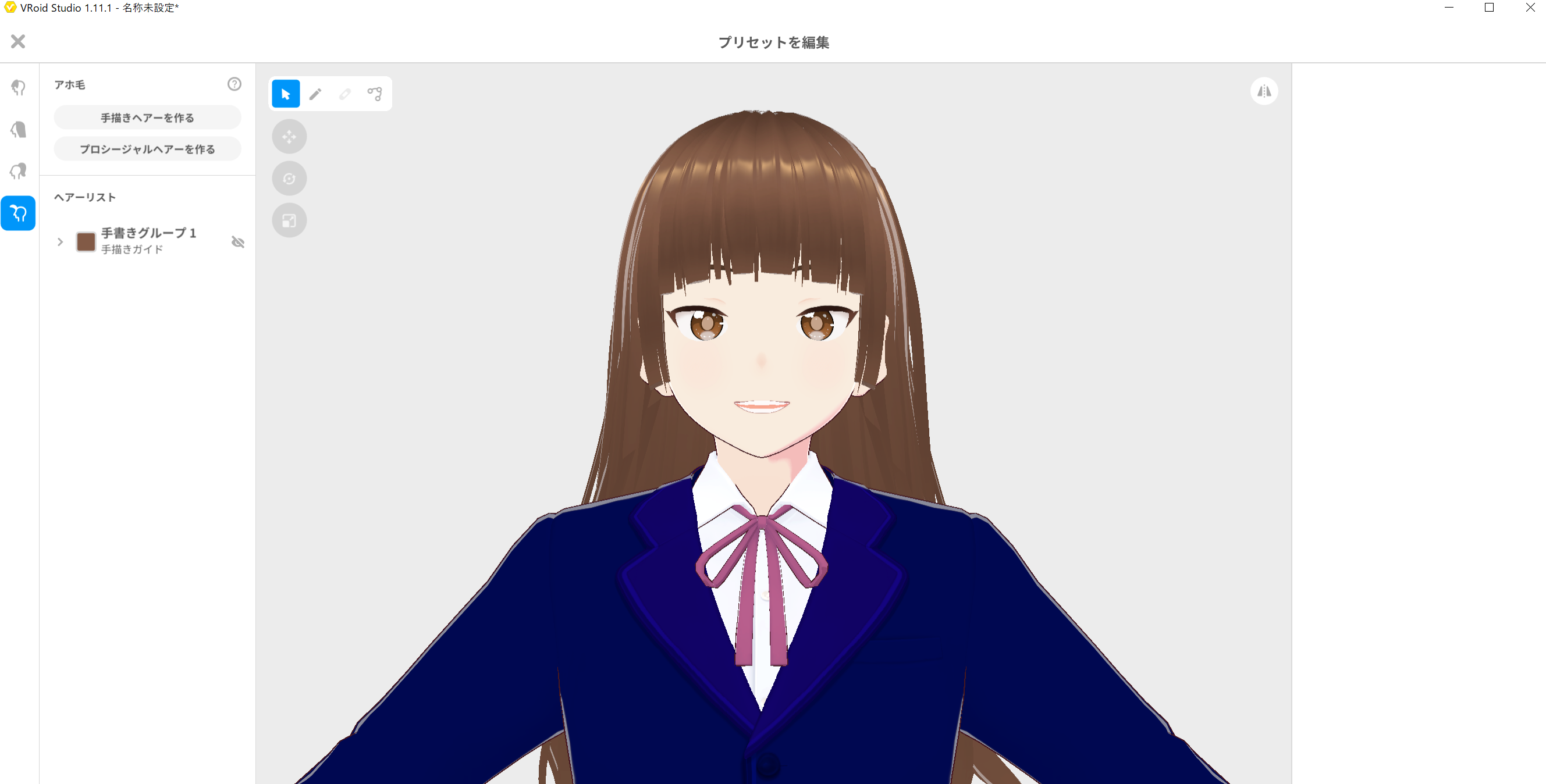 一番左を選びますと、髪の大きさや回転など細かな設定が出来ますし、鉛筆マークを選びますと、髪を書き足したりする事が出来ます。大分慣れてきたら、その様な事にも、チャレンジしてみて下さい。