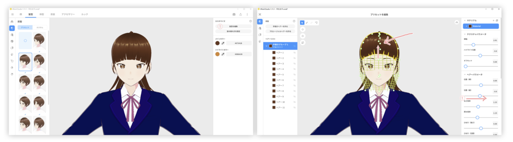 先程は、前髪全体の長さを調整しましたが、今度は、一部の位置(横)スライダーを使いました。