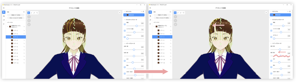 前髪の位置調整です。①位置の縦スライダーを動かす事で、前髪の長さが変わりました。