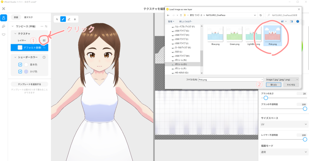 ①左の衣装中から、ワンピースを選びます。続いて、種類の中から、重なっても大丈夫な物、②黒い衣装なら黒を、白い物なら白を選ぶと良いと思います。続いて、③テクスチャーの編集をクリックします。