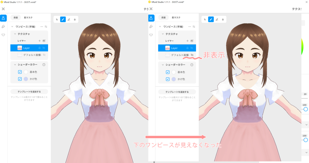 上手く衣装が付いたら、最初の説明通りに、デフォルト画像を非表示にします(デフォルト画像の目玉マークをクリック)。これで下の白いワンピースが見えなくなりました。