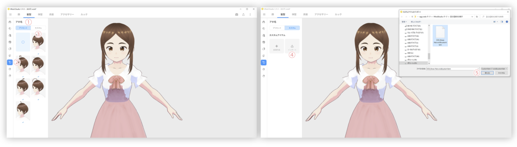 ①上段の髪型から、指定の②アホ毛を選択します。続いて、③カスタムを選択して、説明通りインポートをクリックします。