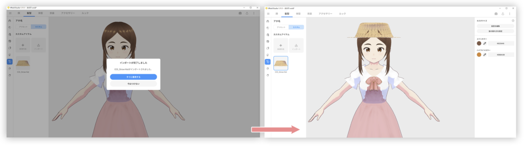この時点で、カスタムアイテムの中に、麦わら帽子が出来ました。今回は、今すぐ着用するを選択して、完了です。