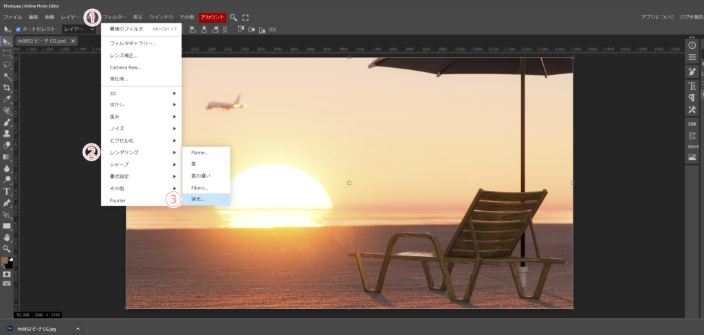 ①上段のフィルターから、②レンダリング、③逆光と進みます。