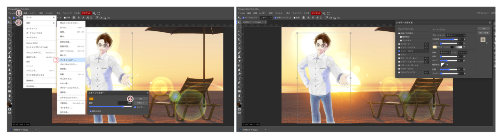 夕日の画面なので、オレンジ色に変化を付ける様に、①上段の画像から、②調整、③フォトフィルター、④問題無ければ、OKボタンで確定します。